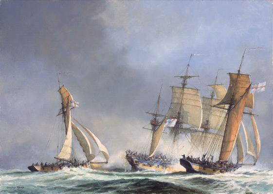 Spring, 1792 . . . Captain Richard Bolitho is offered command of three Royal Navy topsail cutters in the Nore, as clouds of war rise once more over the Channel, in Alexander Kent's novel, With All Despatch. Geoffrey Huband depicts Bolitho’s two small cutters, Telemachus (left) and Wakeful (right), engaging the French corvette La Foi in the decisive battle at sea.